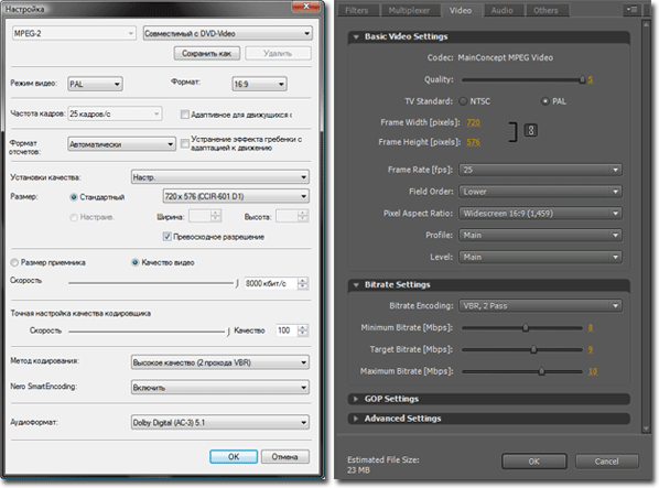 Закодируем всё тот же ролик с совершенно одинаковыми настройками последовательно в Nero Vision и в Adobe Media Encoder. Вот они, эти настройки:
