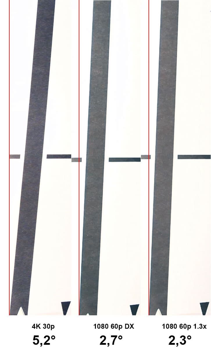 А вот и нет! Опасения оказались напрасными. Полученный результат в 5,2° при съемке в 4K можно считать очень хорошим для фототехники, снимающей видео с таким размером кадра. Для сравнения приведем несколько примеров: при съемке в 4K фотоаппарат Panasonic DMC-G7 допускает наклон вертикалей в 7,7°, фотоаппарат Panasonic DMC-GX8 — 6,7°, Samsung NX-500 — 4,9°, а Sony DSC-RX100M4 наклоняет линию до 9,5°.
