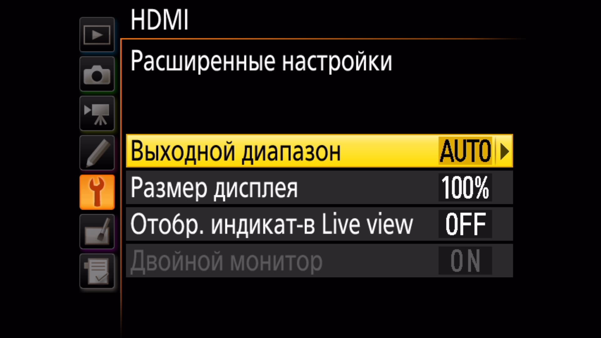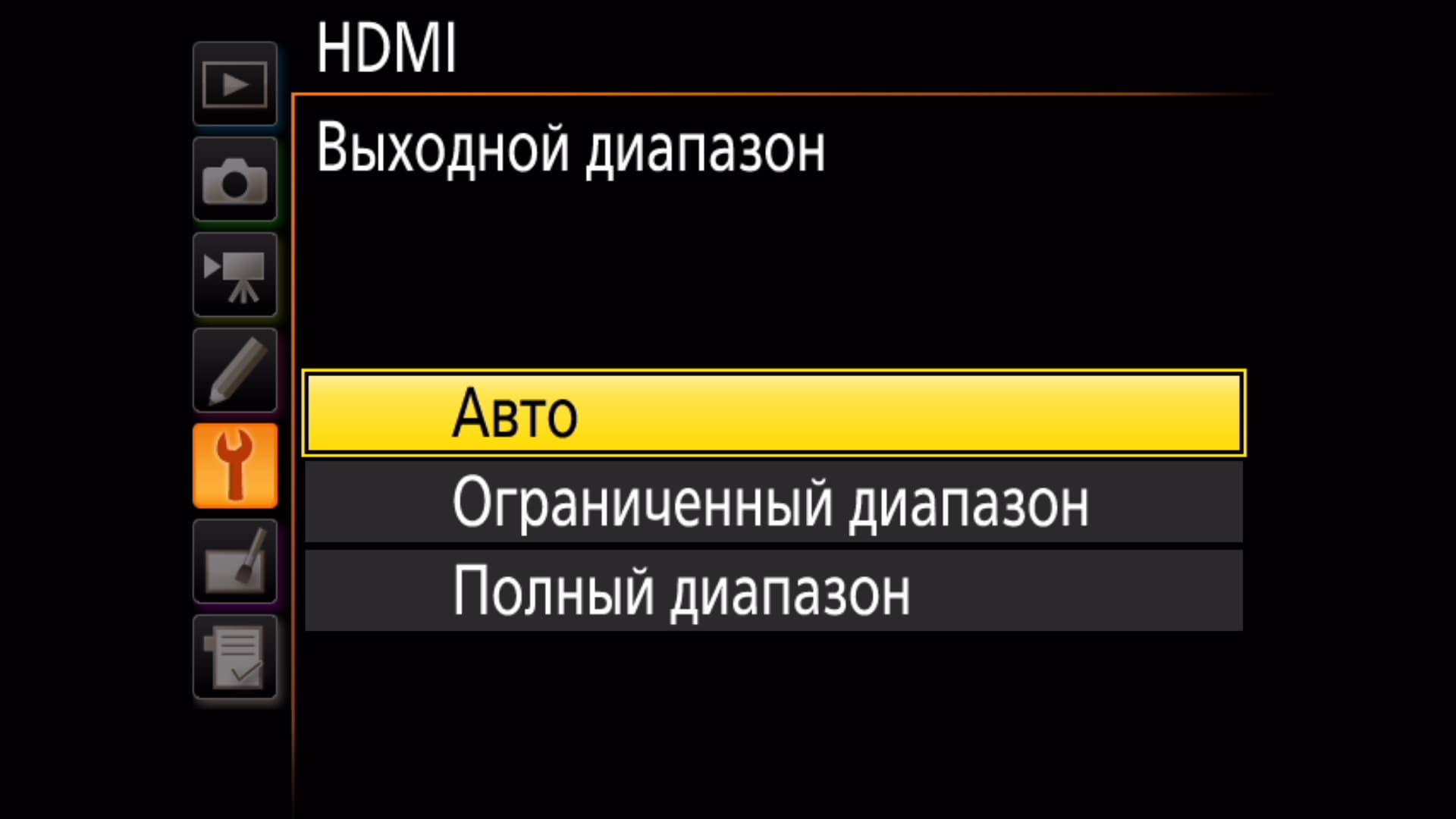 HDMI-выход аппарата поддерживает вывод сигнала разрешением вплоть до 2160p. При захвате в Full HD появляется возможность получить 8-битный сигнал с глубиной цветовой субдискретизации 4:2:2. Настройки HDMI содержат также возможность изменения диапазона вывода.