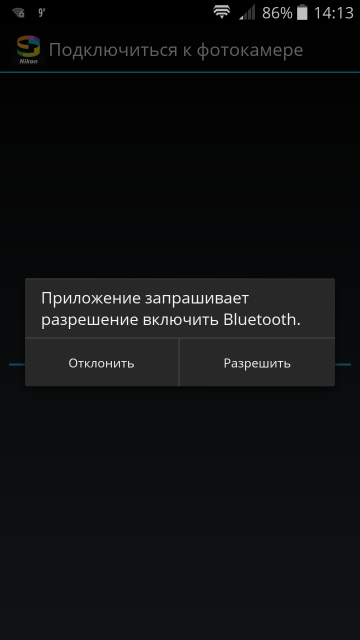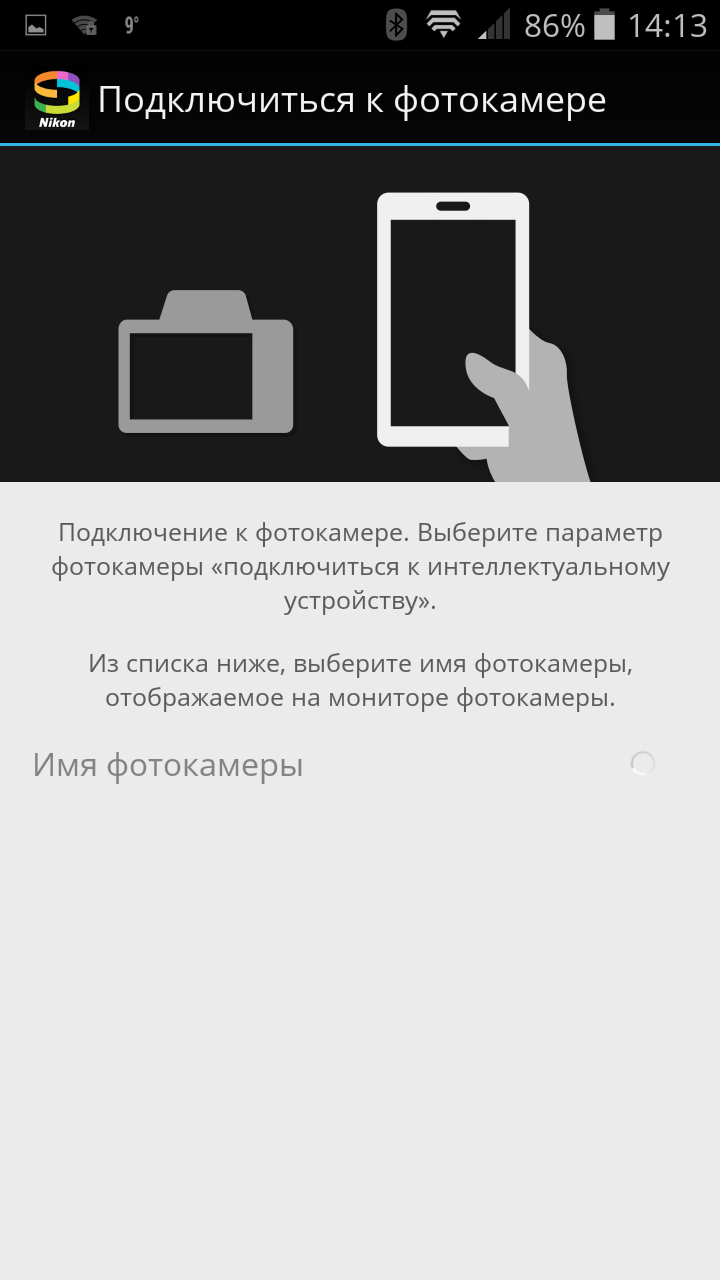| Старт фирменного приложения Nikon SnapBridge | Пустой список Имя фотокамеры, в котором должна отобразиться камера, ожидающая соединения | Уведомление о поддержке смартфоном требуемой технологии (скриншот приложения для тестирования) |