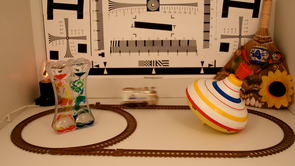 Поскольку в нашей фотокамере используется многомегапиксельная матрица, то можно ожидать заметный уровень роллинг-шаттера (подробнее см. в материале Роллинг-шаттер в видеосъемке — описание дефекта, примеры, пояснения). Чтобы оценить его степень, измерим угол наклона вертикалей с помощью нашего стенда с диском, который вращается с постоянной скоростью.