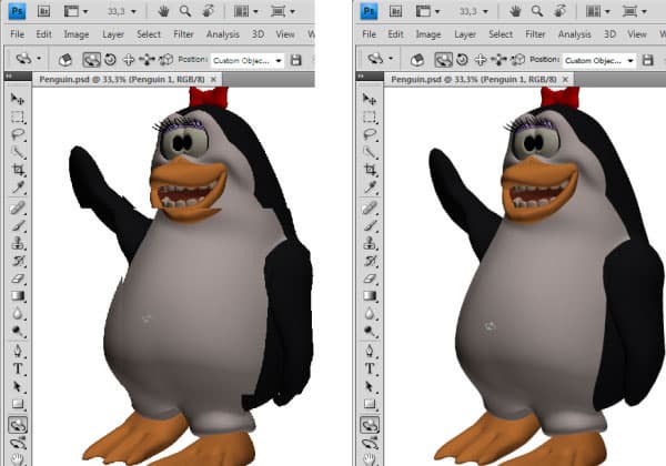 В новой версии Photoshop появилась возможность работать с 3D-объектами, уж этим-то мы не преминем воспользоваться. Создадим в документе новый слой из импортированной модели пингвина, и покрутим толстячка влево-вправо. Пингвин тут совсем не радует глаз — края фигуры негладкие, рваные, а во время поворота модели она то и дело разбивается на части. С Quadro CX — совершенно иной коленкор. Края модели сглажены (технология Edge Antialiasing в действии. Именно краевое сглаживание всегда было отличительной чертой видеокарт серии Quadro и остальных видеокарт профессионального назначения, ведь для CAD/CAM систем, где идет работа прежде всего с каркасом (wireframe), в первую очередь требуется акселерация отрисовки линий со сглаживанием, а не текстурирование, скорость которого важнее в игровых картах). Во время поворота трехмерной модели никаких артефактов не наблюдается. Между прочим, температура графического процессора и здесь растет, правда, незначительно.