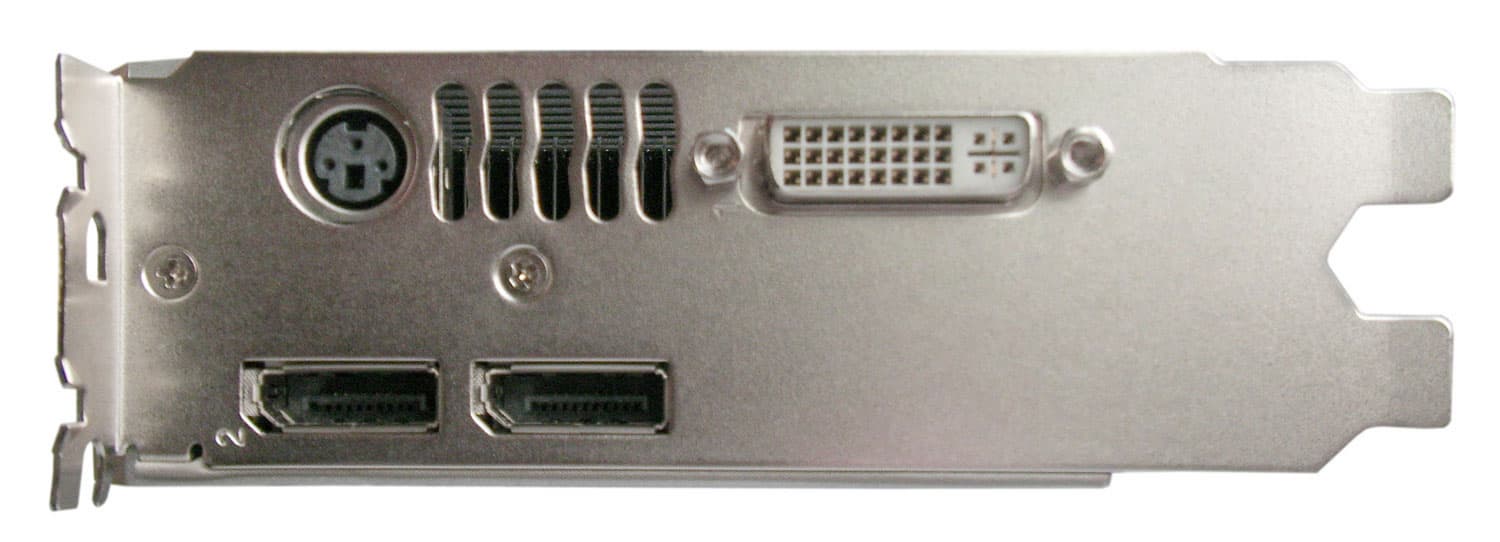 Видеокарта оснащена четырьмя видеовыходами: один DVI-I и два выхода Display Port, а трёхпиновый mini-DIN коннектор предназначен для подключения стерео-очков.