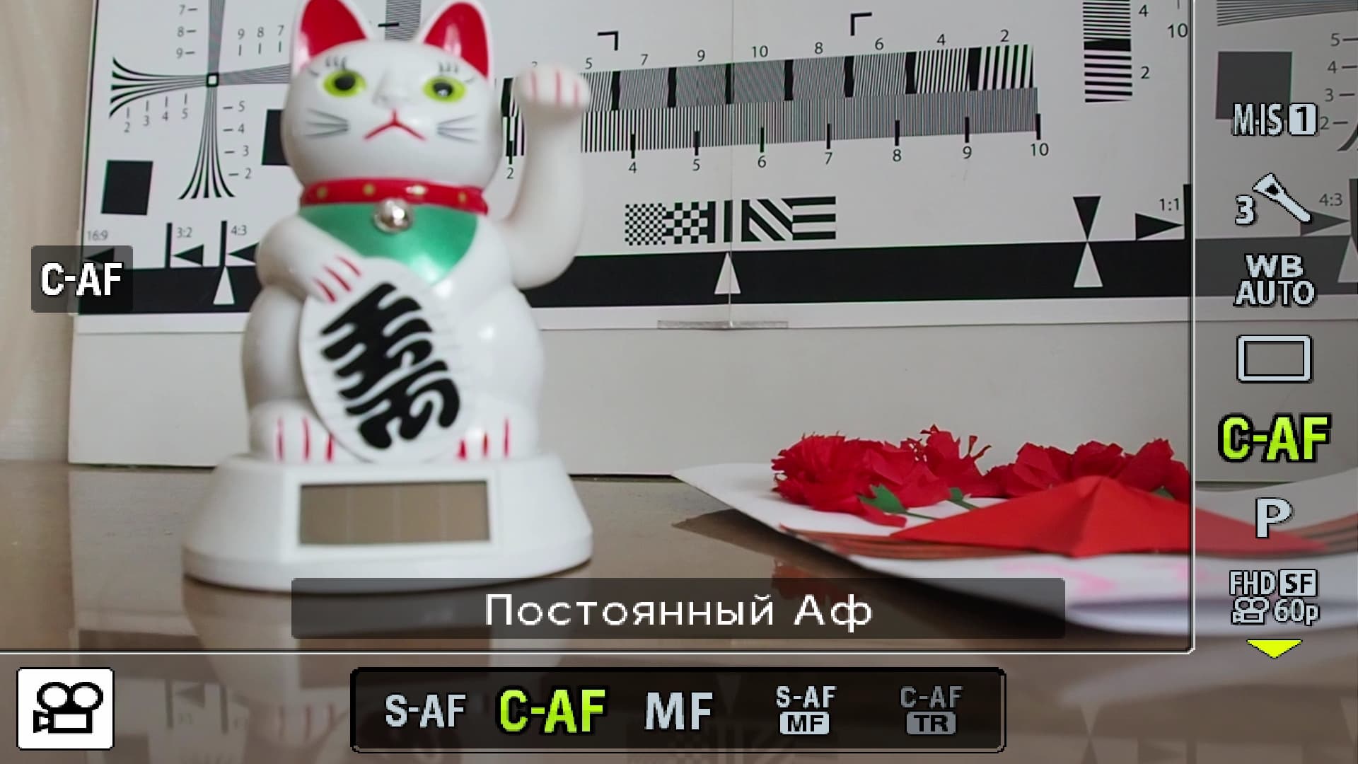 Работу автофокуса (а мы пользовались в основном обычной постоянной автофокусировкой) можно охарактеризовать как нетипичную. А именно: в условиях, близких к идеальным (казалось бы) он ведет себя не так внятно, как в условиях реальной съемки, когда в кадре присутствует большое количество разноудаленных контрастных объектов. Это хорошо для обычного оператора «из жизни», который вряд ли занят стендовой съемкой контрастных бумажных мишеней, но во время тестирования такое поведение автофокуса, признаться, немного сбило с толку.