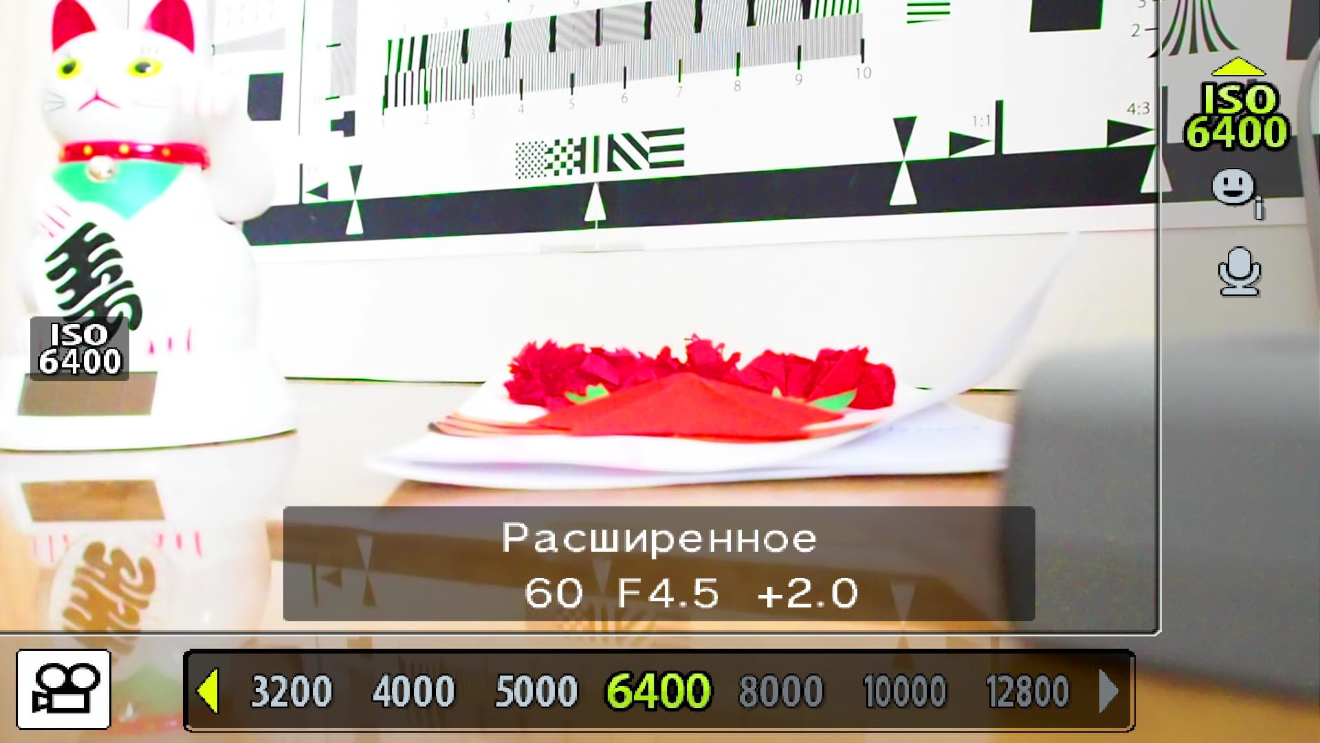 Присутствует большой выбор чисел ISO, так как дискретность в списке доступных значений достаточно короткая: ISO 200/250/320/400/500/640/800 и так далее. Во время следующей видеосъемки мы ограничились шестью вариантами, от ISO 200 до максимально возможного ISO 6400.