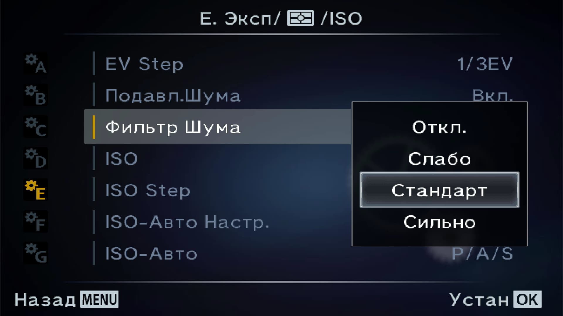 Проверим данную теорию. В этом помогут имеющиеся в фотоаппарате настройки шумоподавления (кстати, подобные настройки можно отыскать лишь в «серьезных» камерах топ-класса или аппаратах из профессионального сегмента). Как видно из скриншота настроек, здесь имеется возможность отключить подавление шума, либо выбрать одну из трех степеней шумоподавления: Слабо, Стандарт и Сильно.