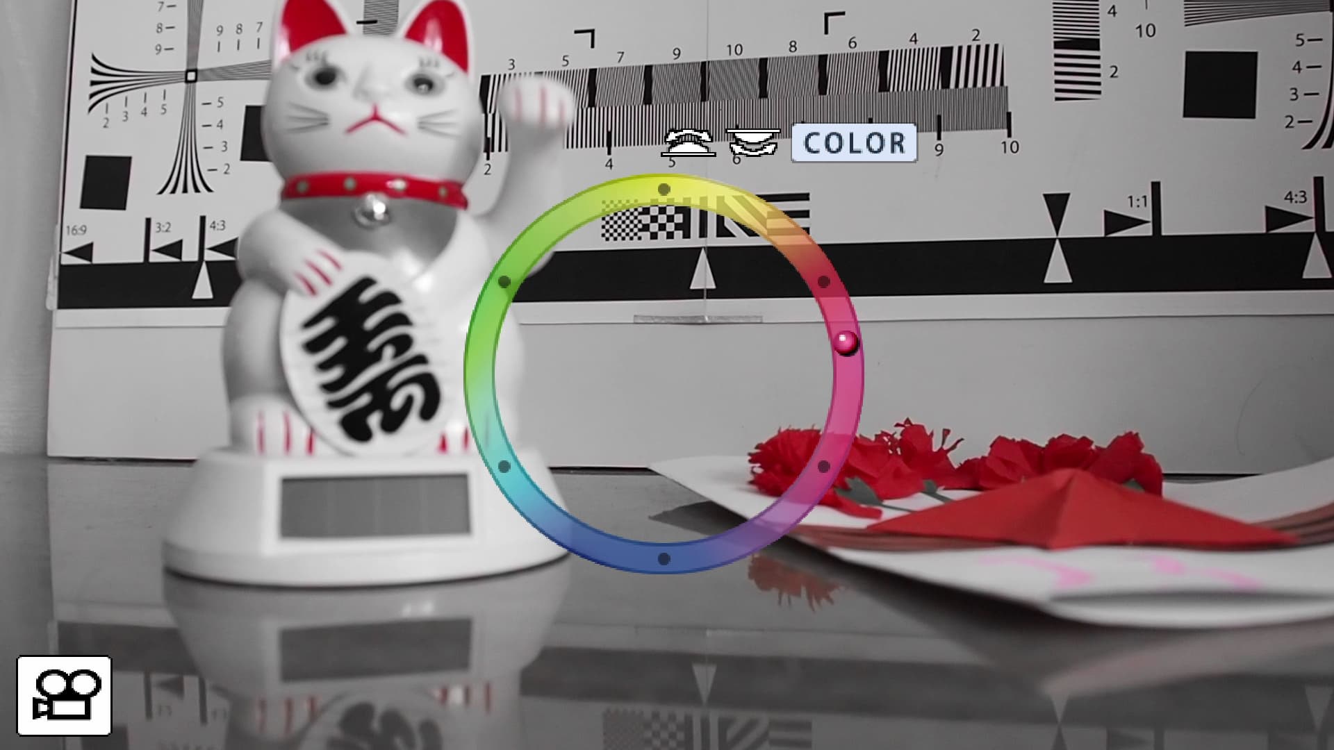 Хочется отметить оригинальное исполнение одного из режимов, в котором реализована съемка отдельного цвета с исключением всех прочих цветов: выбор требуемого цвета, на котором фотоаппарату следует акцентировать внимание, производится с помощью цветового колеса. Вращением одного из настроечных роликов осуществляется перемещение по кругу точки выбора цвета, одновременно с этим на дисплее отображается тот цвет, в зоне которого эта точка находится. Непосредственно во время видеосъемки изменить отображаемый цвет и другие настройки нельзя, все параметры выбираются до старта записи и затем фиксируются.