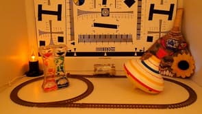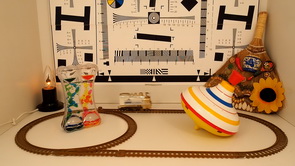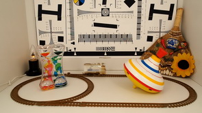 Поскольку в нашей фотокамере используется многомегапиксельная матрица, то можно ожидать довольно высокий уровень роллинг-шаттера (подробнее см. в материале Роллинг-шаттер в видеосъемке — описание дефекта, примеры, пояснения). Чтобы оценить его уровень, узнаем сначала угол наклон вертикалей с помощью нашего стенда с диском, который вращается с постоянной скоростью.