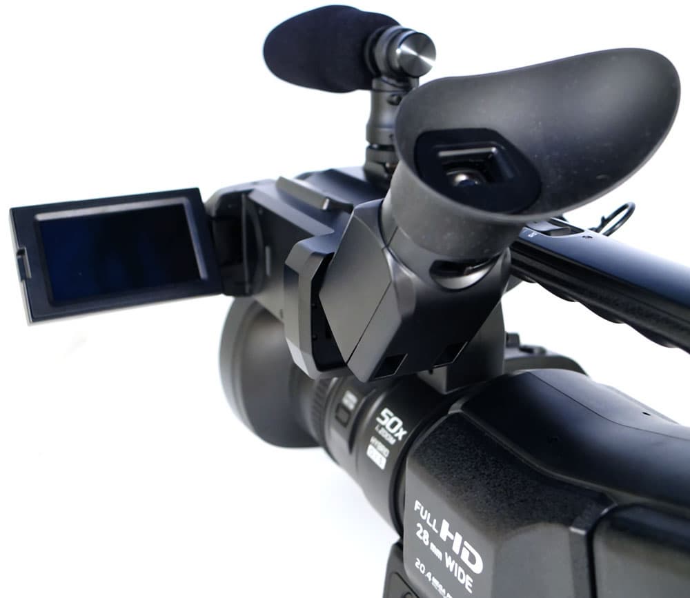Дополнительный блок расположен в передней части камеры, в стороне от объектива, и снабжен рукояткой с регулировкой под размер ладони. Здесь же находится качалка зума, имеющая больший размер, нежели на верхней рукоятке, и, соответственно, больший ход. Рядом с качалкой находится кнопка Photo, а на торце блока, под большим пальцем руки, привычно расположилась кнопка Rec. Данная кнопка обрамлена подвижным кольцом с фиксатором — поворот данного кольца включает и отключает питание камеры.