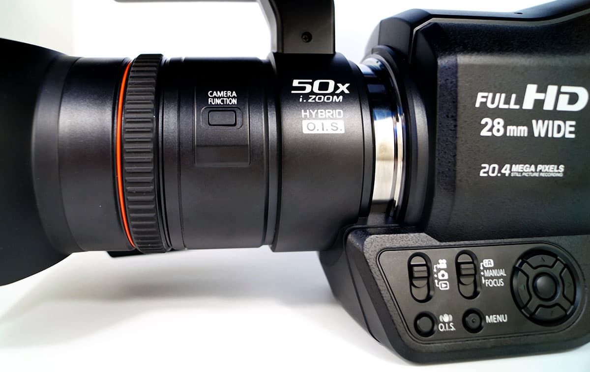 Стекло объектива защищено глубокой блендой и съемной пластиковой крышкой. Встроенные стереомикрофоны выдаются далеко вперед, и «смотрят» в том же направлении. Внешний микрофон можно подсоединить к одной из двух площадок, находящихся в верхней части камеры и расположенных ближе к объективу: в центре или сбоку.