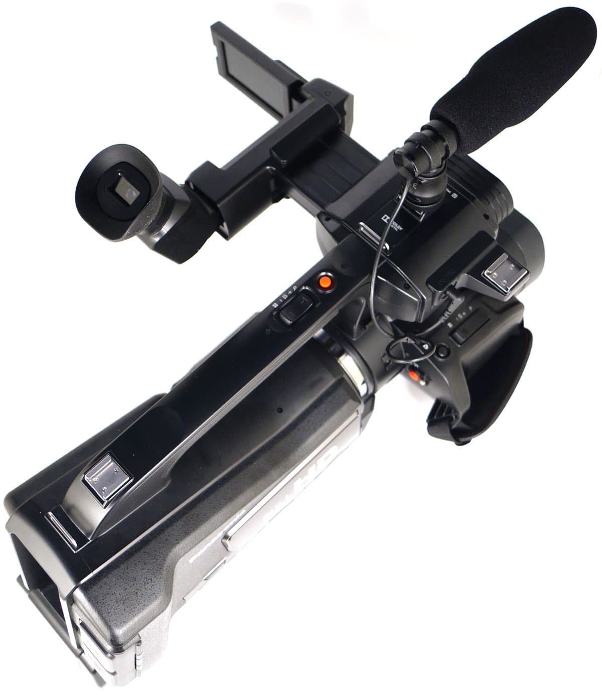 Верхняя рукоятка, служащая как для переноски камеры, так и для удержания аппарата при съемке, оснащена качалкой зума, кнопкой старта/останова записи, двумя металлическими ушками для крепления ремня, а также еще одной посадочной площадкой-башмаком, расположенным ближе к торцу камеры. Думается, эта площадка может пригодиться для крепления, к примеру, внешнего монитора с большой диагональю.