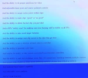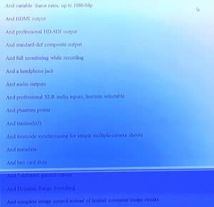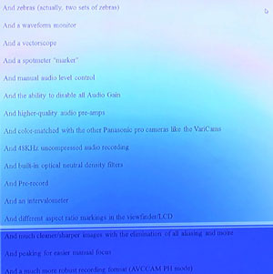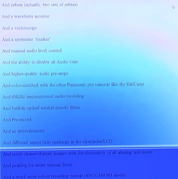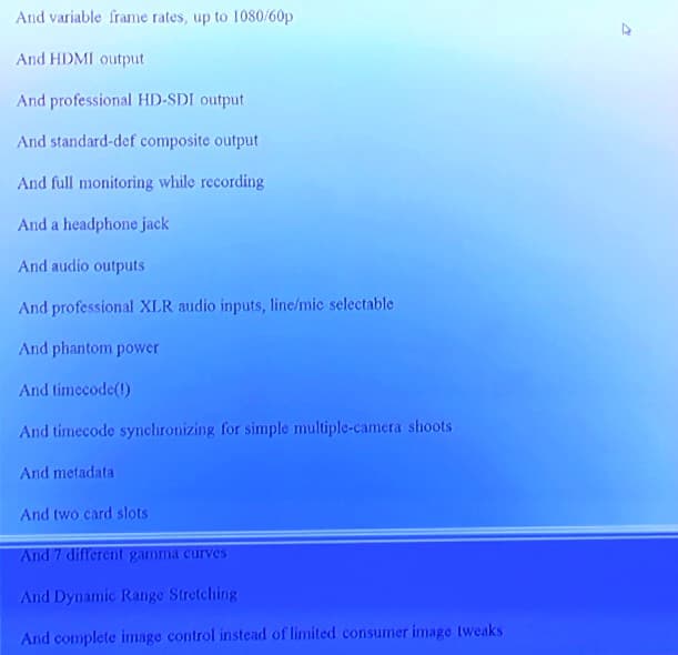 Далее Барри проагитировал всех энтузиастов VDSLR переходить на профессиональные видеокамеры. Список преимуществ профессиональных видеокамер по сравнению с бытовыми DSLR:
