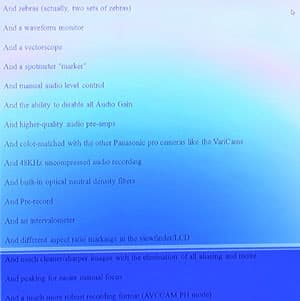 Дальше разговор пошёл о двух новых камерах AG-HPX250 и AG-AC160. Барри отметил, что в видеоиндустрии многое изменилось. Многие люди сегодня используют DSLR для съемки видео. Тут Барри изобразил звук, словно его тошнит. Г-н Грин купил себе Canon 7D, Panasonic GH1, Panasonic GH2, поснимал, и теперь прекрасно понимает, почему многие их используют. Есть много причин не использовать VDSLR, так как традиционные профессиональные видеокамеры предлагают гораздо больше возможностей. Часть видеографов не видит никакой альтернативы VDSLR и всячески их превозносит, другие же наслаждаются тем, что постоянно обсуждают недостатки VDSLR. Барри снял на Panasonic GH1 в 2009 году фильм, который открывал фестиваль в Солт-Лейк Сити, и знание на собственном опыте всех достоинств и недостатков VDSLR убедили его отказаться от зеркалок в пользу видеокамер. Основной причиной использования VDSLR Барри Грин считает доступную цену.