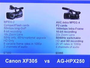 Canon использует устаревший MPEG-2, хотя и пытается компенсировать это большим битрейтом. Битрейт всё равно не в пользу Canon, странный выбор носителей информации CompactFlash, против P2 у Panasonic, с повышенной надежностью и большим числом циклов перезаписи. Panasonic используется новейший 10-битный AVC-Intra кодек MPEG-4. Переключение 50/60 к/с сразу же у Panasonic и за дополнительные деньги у Canon. Небольшое преимущество в кратности зума, не очень важно, но всё равно преимущество. Также до сих пор многие телеканалы требуют предоставить материалы в SD. Эта возможность специально оставлена для совместимости. Кроме того, по MSRP (рекомендованной производителем) цене Panasonic находится в выигрыше, и значительном.