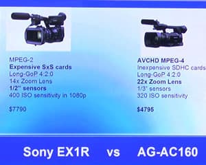 Sony EX1R традиционно недешёвая с дорогими фирменными носителями, наиболее интересное преимущество — в размере сенсора. Он всё ещё маленький, но на 1/6", то есть на 50%, больше по диагонали. Но цена ставит это преимущество под сомнение. Даже более продвинутая 250-я камера стоит намного дешевле.