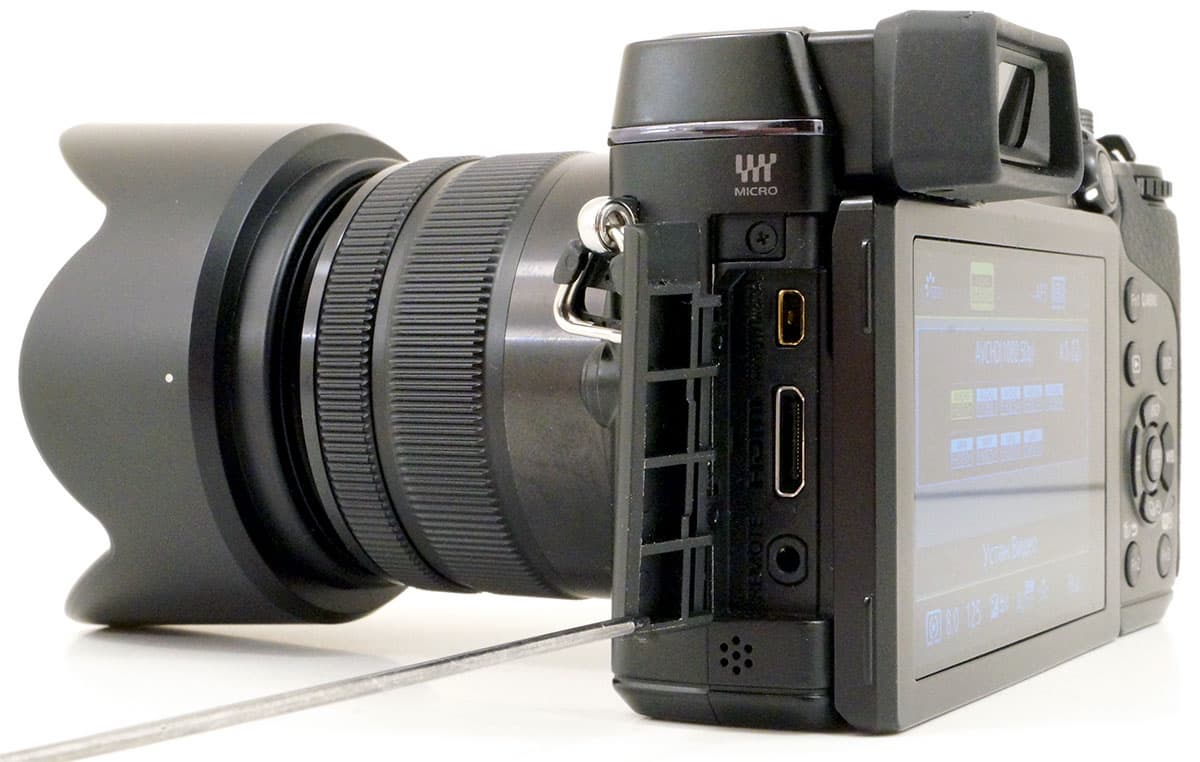 Также аппарат оснащен вполне стандартным выходом Mini-HDMI, а кроме него — входом для фирменного пульта управления. Вот такого.