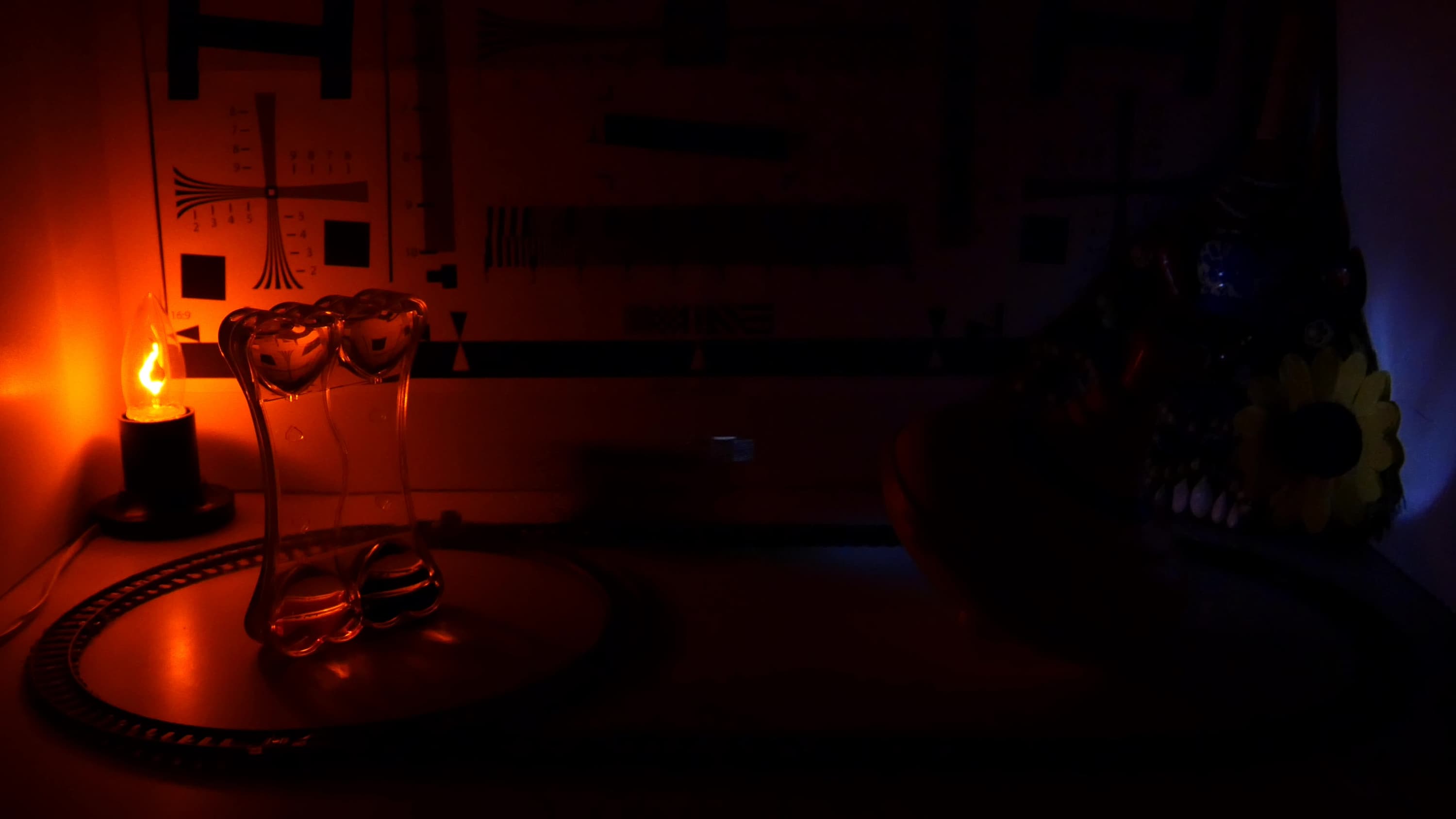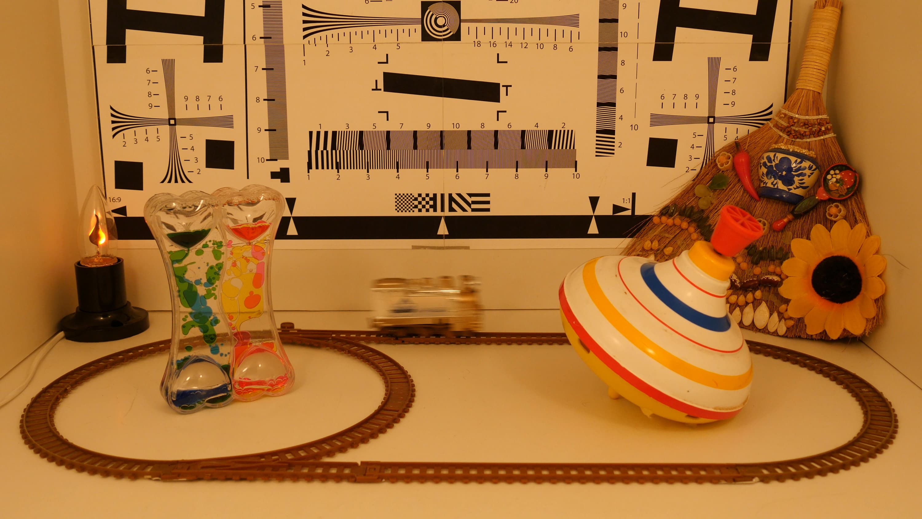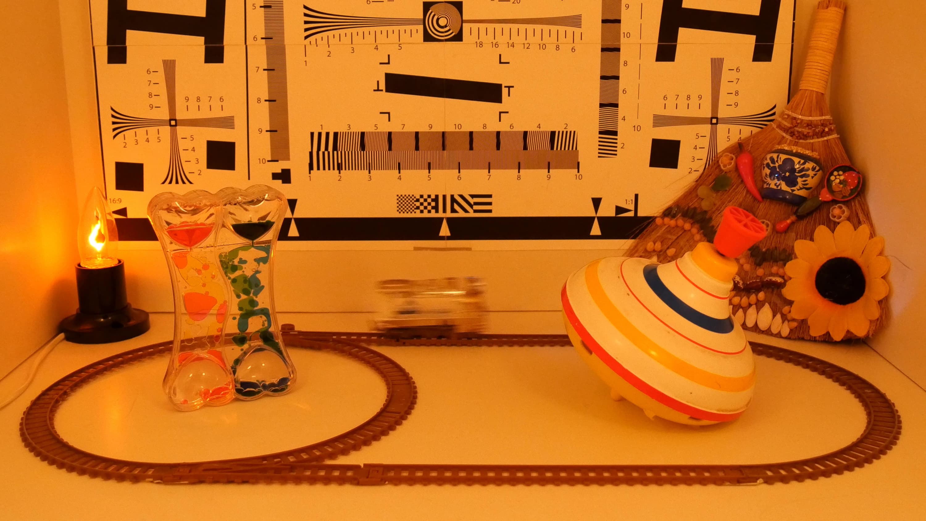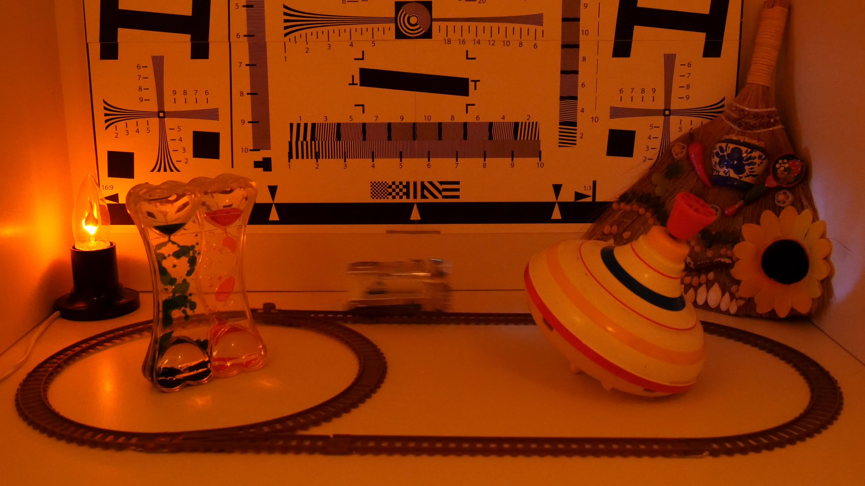 Просьба не обращать внимания на некоторый «завал» в красное — это действие близко расположенных ламп накаливания. В целом чувствительность камеры можно отметить как очень высокую. Достигается она — и это несложно заметить — снижением выдержки (размазанные контуры паровозика). Однако прочие артефакты, как, например, замыленность всего изображения вследствие агрессивной работы шумоподавителя — отсутствуют. Даже при освещенности в пять люксов (а это очень, очень мало для нормальной съемки) объекты, находящиеся в фокусе, остаются одинаково четкими по всему кадру. Чуть заметный шум нисколько не портит картинку. Общее впечатление: пять с плюсом!