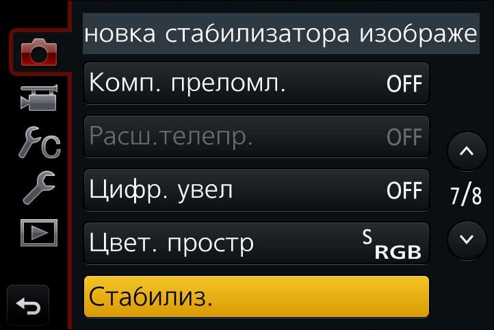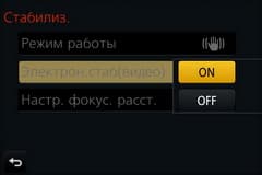 | Выбор ячейки пользовательских настроек | Параметры стабилизатора можно изменить только в фотонастройках | В фоторежиме также доступен электронный (программный) стабилизатор |