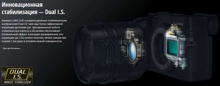 Рассматриваемый фотоаппарат оснащен двойной системой стабилизации: стабилизатор матрицы внутри корпуса и оптический стабилизатор объектива. На скриншоте, полученном со странички продукта, можно видеть графическое изображение этой системы. Здесь налицо искренняя честность производителя. Но присмотритесь: видите сноску со звездочкой?