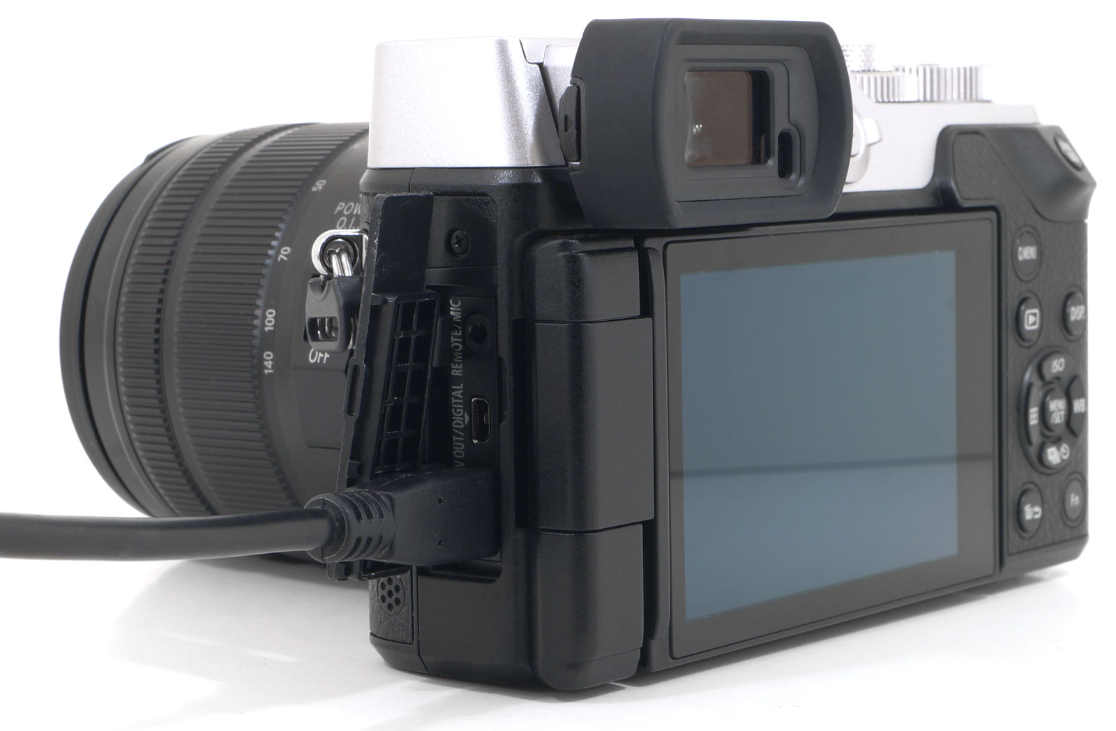 На левой боковой стороне аппарата сосредоточены служебные разъемы, прикрытые заглушкой. Здесь в ряд расположены микрофонный вход диаметром 2,5 мм, который также может служить разъемом для фирменного проводного пульта ДУ, приобретаемого отдельно; USB-порт (используется фирменный разъем — кабель прилагается); видеовыход Micro-HDMI.