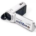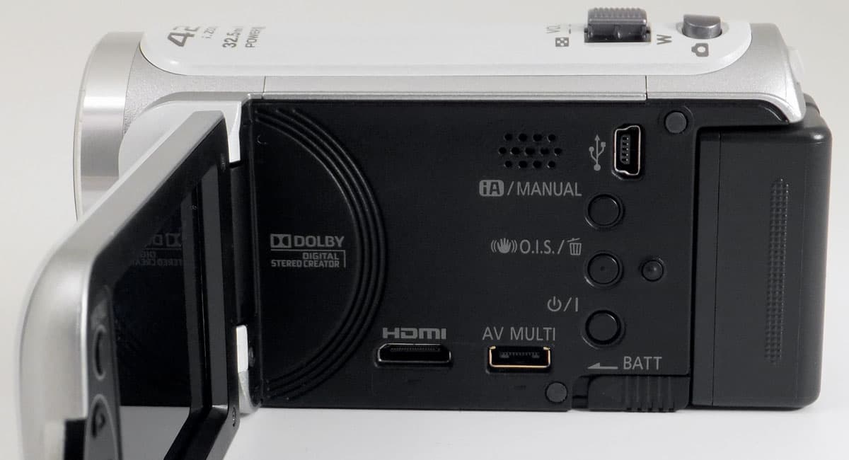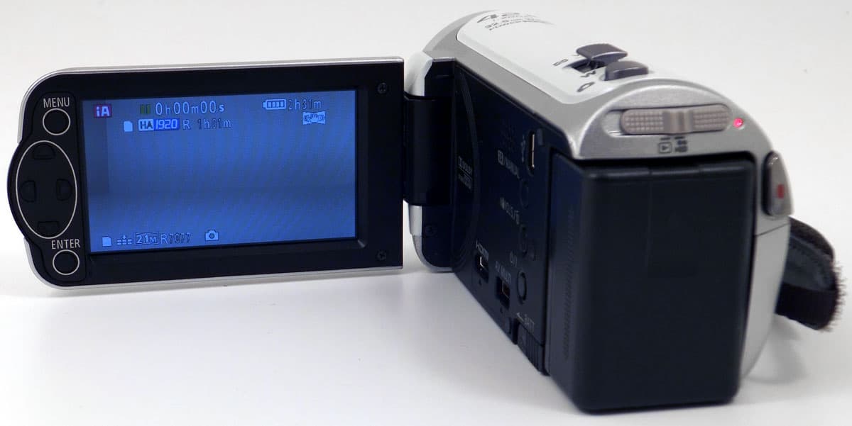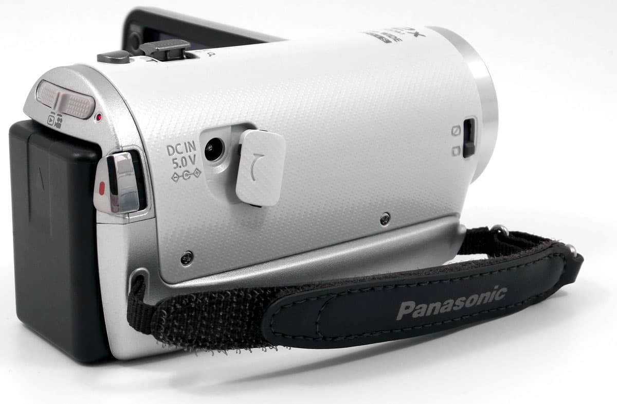 Вход для подключения адаптера питания расположен сбоку и прикрыт заглушкой на резиновой ножке. Вверху корпуса имеется рычажок зума и кнопка PHOTO, нажатие на которую приводит к созданию фотоснимка. С торца камеру украшают главная кнопка старта записи — REC, а также переключатель режимов работы аппарата: плеер, камкордер, фотоаппарат.