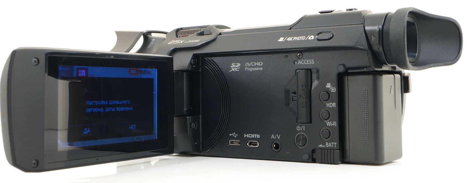 Узнаваемые формы и надписи, но возникает вопрос: а куда делась вторая, twin-камера, что была расположена на рамке откидного дисплея? По всей видимости, кто-то, отвечающий за исследование рынка, сделал вывод, что в топ-классе видеокамер подобные экзерсисы не столь востребованы, как в камерах среднего и низшего ценового диапазона. Ну и хорошо. Жаль только, разработчик не воспользовался появившейся свободной площадью и не увеличил диагональ сенсорного дисплея хоть на самую чуточку.