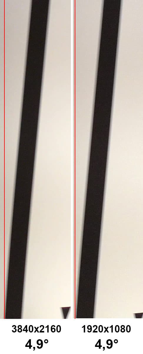 Полученные 4,9° можно назвать средним результатом. Для сравнения, 5,8° — это неплохой показатель современного фотоаппарата, 7,5° — смартфона. Наконец, еще одно характерное сравнение: известная 4K-видеокамера Sony (Sony FDR-AX100) вовсе показывает наклон до 9,1°. В реальной жизни эти наклоны вертикалей могут проявиться при съемке быстродвижущихся объектов (например, проезжающий через кадр машин) или при быстром горизонтальном панорамировании, когда даже сама камера возмущается и предупреждает оператора о недопустимости подобного рода художественных приемов.