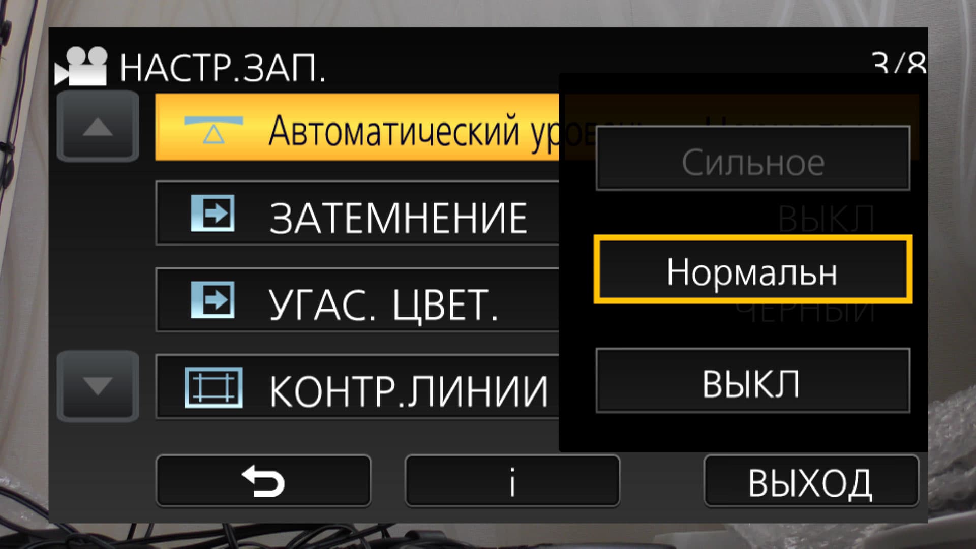 Помимо стабилизатора, который компенсирует излишнее движение камеры по осям X и Y, камера предоставляет еще один инструмент, автоуровень. Судя по его названию, он выравнивает картинку на основании показаний встроенного датчика, приводя ее «к горизонту». Эта опция имеет два режима чувствительности — Нормальный и Сильный. Однако при съемке в формате 4K доступен лишь первый режим, Нормальный.