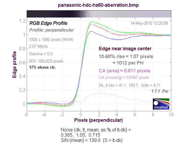 График хроматической аберрации (на самом деле, это тот же краевой профиль, только построенный по каждому цвету в отдельности). При значении параметра CA (area) равным 0-0.5 хроматическая аберрация не заметна.