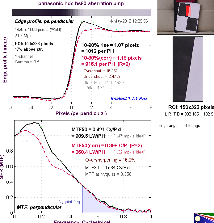 Верхний график представляет собой краевой профиль, для которого приведено значение 10-90% rise distance в пикселях, а нижний график представляет собой MTF (Modular Transfer Function — функция передачи модуляции), для которой приведен параметр MTF50 в циклах на пиксель. Краевой профиль и MTF камеры показаны черной линией. Красной пунктирной линией обозначен краевой профиль и MTF, которые программа Imatest считает близкими к оптимальным. 10-90% rise distance и MTF50 также являются расчетными величинами Imatest.