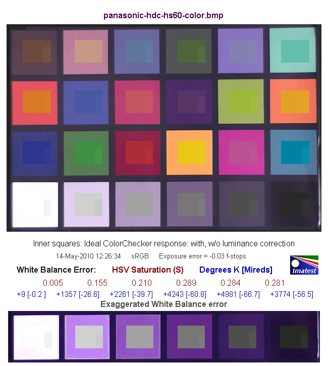 Средняя строчка цифр показывает нам численную оценку ошибки баланса белого в единицах цветового пространства HSV. Так, цифры красного цвета обозначают ошибку по координате S — saturation (насыщенность), цифры синего цвета — в градусах Кельвина [Миредах (Mireds)]. При значении S < 0.02 (речь идет об ошибке по координате S в HSV), ошибка практически незаметна, а при ошибке S > 0.10 она видна, особенно на нейтральных полях большой яркости.