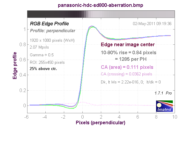 График хроматической аберрации (на самом деле, это тот же краевой профиль, только построенный по каждому цвету в отдельности). При значении параметра CA (area) равного 0—0,5 хроматическая аберрация незаметна.