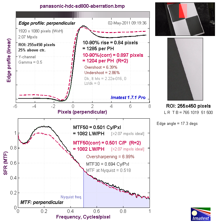 Верхний график представляет собой краевой профиль, для которого приведено значение 10—90% rise distance в пикселях, а нижний график представляет собой MTF (Modular Transfer Function — функция передачи модуляции), для которой приведен параметр MTF50 в циклах на пиксель. Краевой профиль и MTF камеры показаны черной линией. Красной пунктирной линией обозначен краевой профиль и MTF, которые программа Imatest считает близкими к оптимальным. 10—90% rise distance и MTF50 также являются расчетными величинами Imatest.