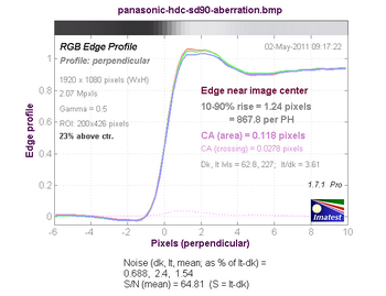 График хроматической аберрации (на самом деле, это тот же краевой профиль, только построенный по каждому цвету в отдельности). При значении параметра CA (area) равного 0—0,5 хроматическая аберрация незаметна.