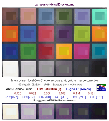 Средняя строчка цифр показывает нам численную оценку ошибки баланса белого в единицах цветового пространства HSV. Так, цифры красного цвета обозначают ошибку по координате S — saturation (насыщенность), цифры синего цвета — в градусах Кельвина [Миредах (Mireds)]. При значении S < 0,02 (речь идет об ошибке по координате S в HSV), ошибка практически незаметна, а при ошибке S > 0,10 она видна, особенно на нейтральных полях большой яркости.