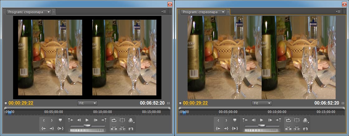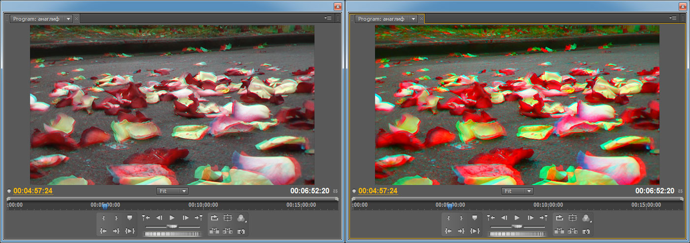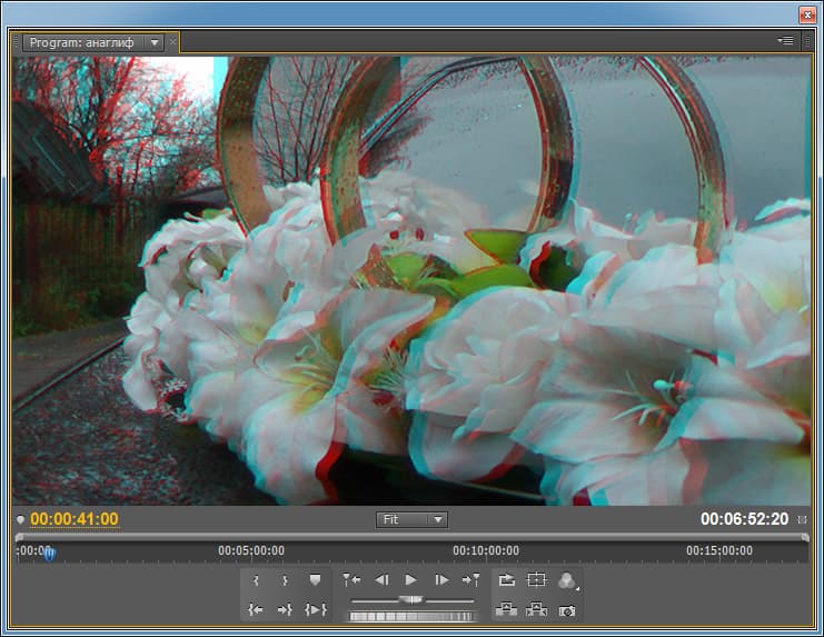 Voila, несколькими элементарными действиями мы добились отображения анаглифического стерео непосредственно в окне Program. Можно водружать на переносицу красно-синезелёные очки и монтировать, тут же видя результат в стереорежиме.