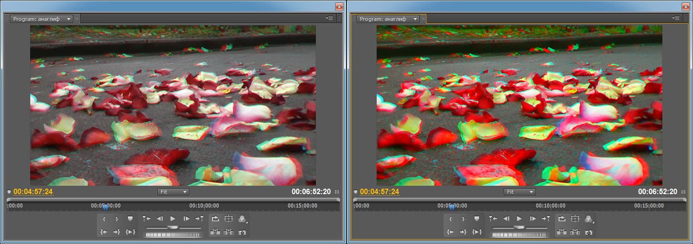 Неприятная особенность анаглифического способа представления стереоматериала: при просмотре через очки теряется цвет, видео похоже на неправильно подкрашенный чёрно-белый фильм. Этот недостаток можно частично уменьшить, если применить к конечному результату монтажа фильтр Fast Color Corrector, подкрутив в нём параметр Saturation. Теперь хотя бы трава выглядит зелёной, а не грязно-серой.