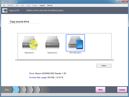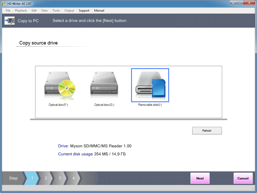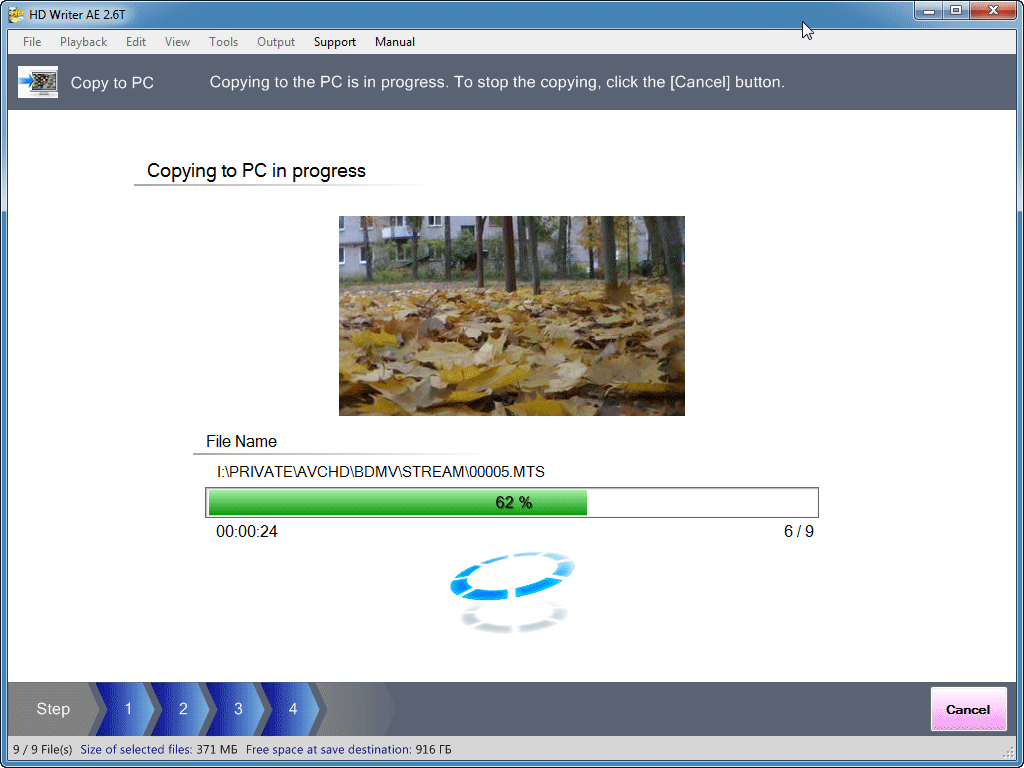 Импорт видео в программу ведётся как непосредственно с подключённой камеры, так и с карты памяти. Главное, чтобы не была нарушена структура служебных папок, которые создаёт видеокамера. Отдельные файлы MTS программа попросту не увидит.