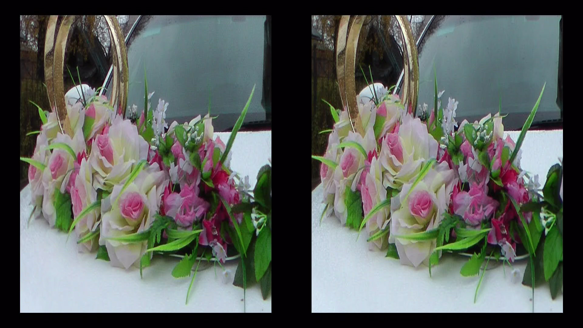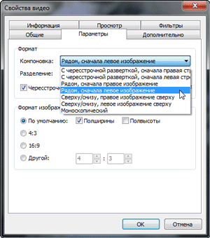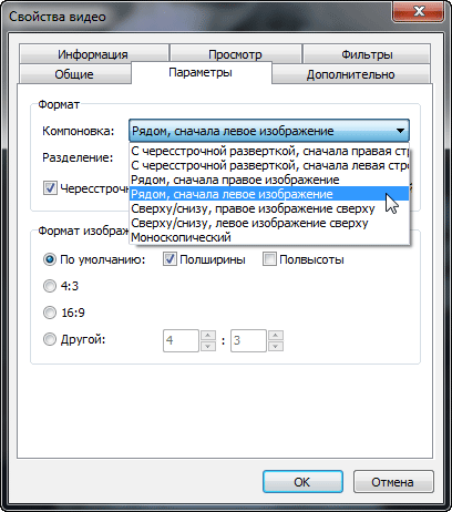 И лишь при воспроизведении готового ролика мы увидим стереоизображение с естественными пропорциями кадра. Для этого нужно указать плееру на формат скормленного ему видео: Left/Right, Half Width (Левый/Правый, половина ширины).