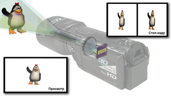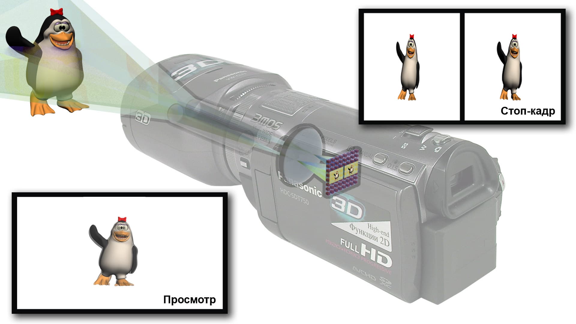 Из конструкции аппарата нетрудно представить принцип его работы. Свет, поступая в стереонасадку, разбивается на две части, которые попадают в оптику камеры, а оттуда — прямиком на матрицу. В результате на матрице формируется кадр, состоящий из двух картинок. Размеры этих картинок пока ещё не искажены, пропорции обоих кадров, левого и правого, остаются оригинальными, 16:9. Но теперь в дело вступает электроника, программно сплющивая оба кадра по горизонтали так, чтобы они уместились в отведённых 1920 точках.
