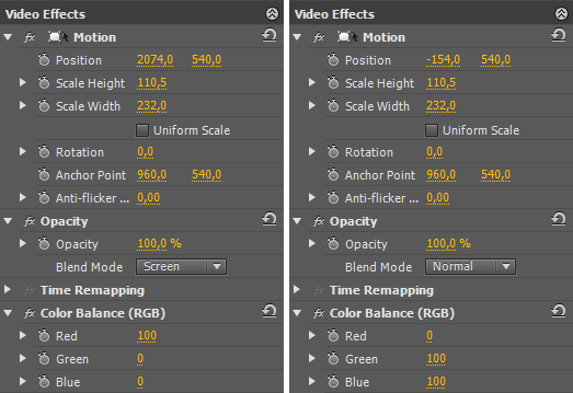 Что касается монтажа в анаглифическом формате, это легко делается здесь же, в Premiere Pro. Достаточно сделать дубликат таймлинии «стереопара», назвать новую таймлинию «анаглиф», затем удалить фильтр Crop, растянуть левый и правый кадры до размеров 1920×1080 и добавить к ним другой фильтр: Color Balance (RGB) с особыми настройками (см. рис.). В заключение требуется присвоить в левом кадре параметру Blend Mode значение Screen.