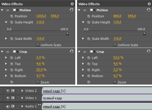 Сначала поместим весь видеоматериал, который собираемся монтировать, на одну таймлинию, и назовём её «левый кадр». Затем нужно сделать дубликат данной таймлинии, и переименовать в «правый кадр» (заодно, пока не забыли, отключим в «правой» таймлинии звук). Теперь нужно создать третью таймлинию с названием «стереопара», и расположить на ней две первые таймлинии друг над другом. Осталось лишь добавить к этим двум таймлиниям фильтр Crop и ввести необходимые настройки положения и увеличения левого и правого кадров соответственно.