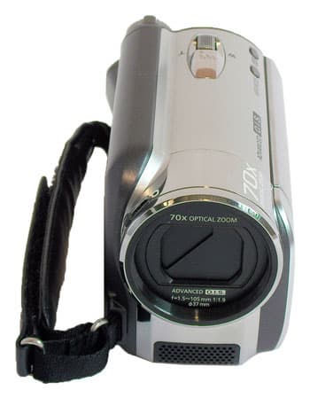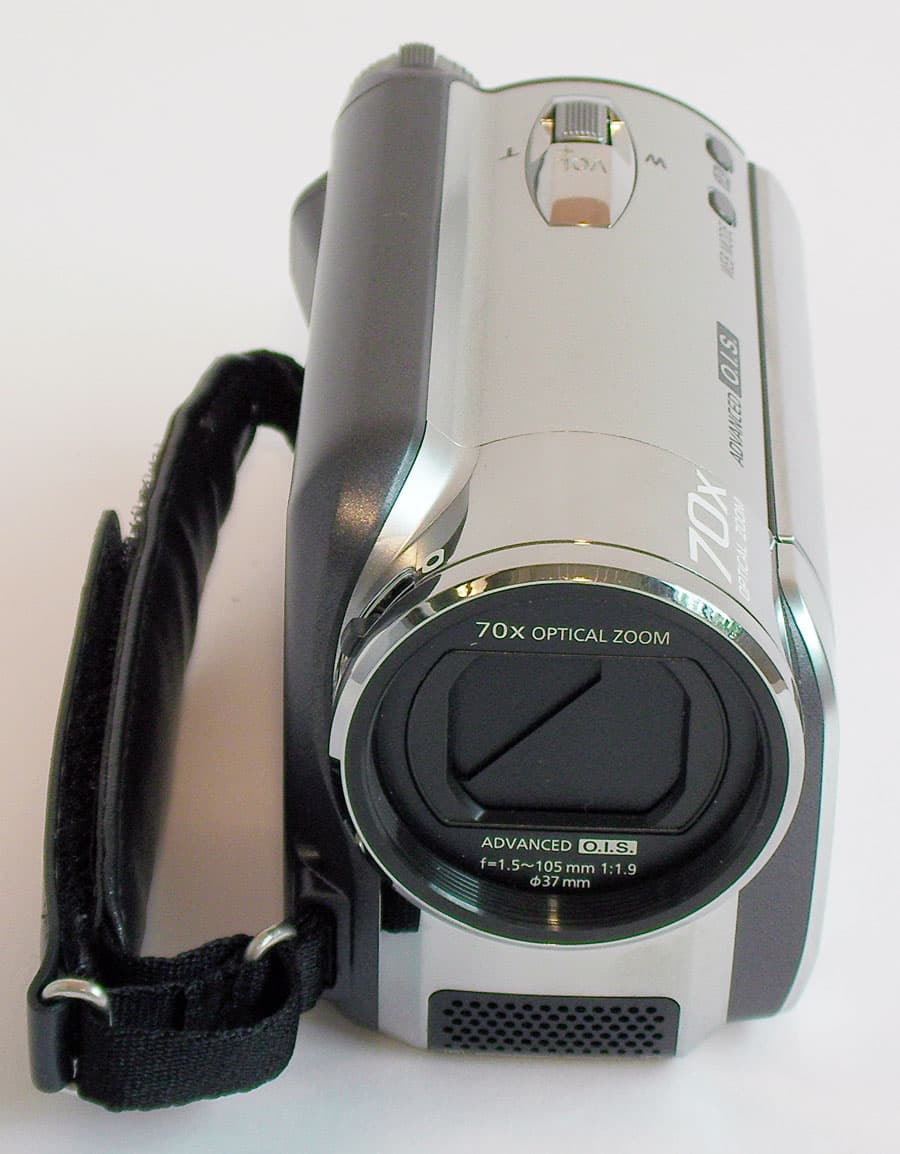 Сбоку от объектива находится рычажок, которым вручную открываются и закрываются защитные шторки. Стереомикрофоны расположены под объективом, встроенная вспышка в видеокамере отсутствует.