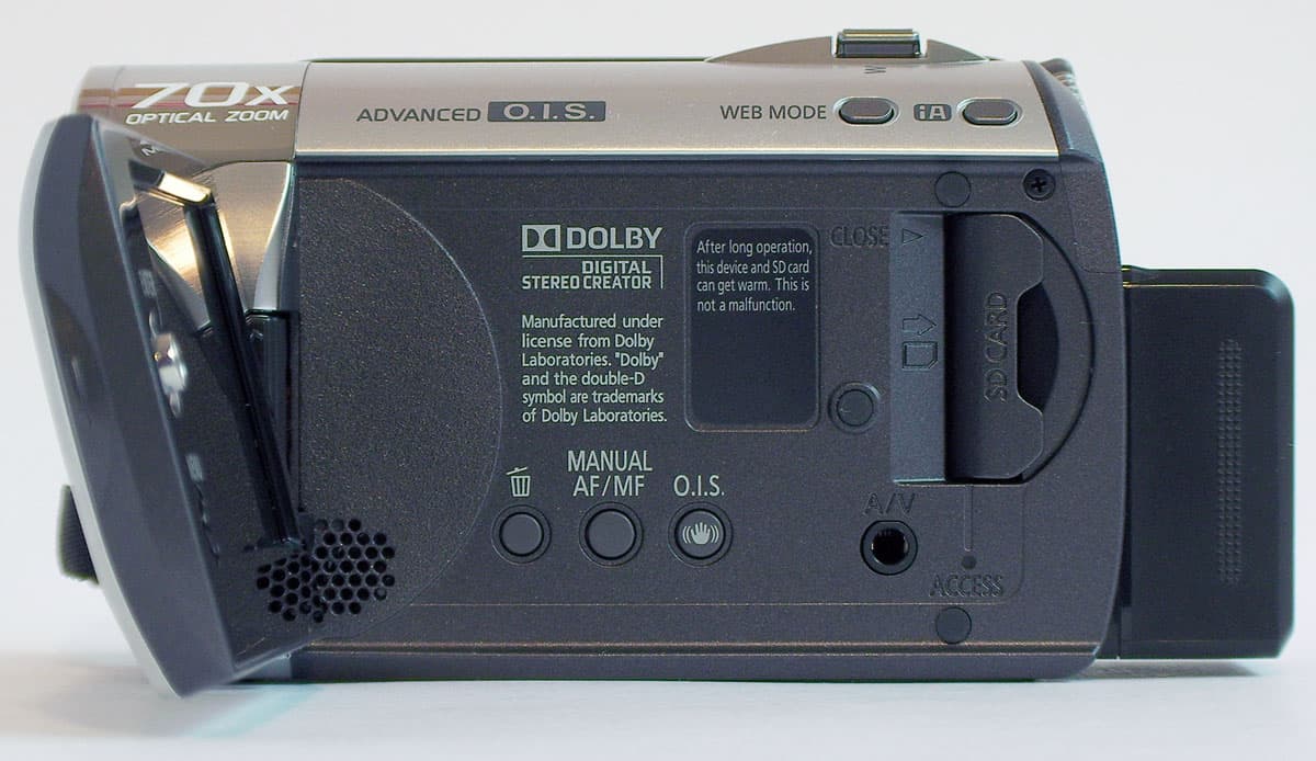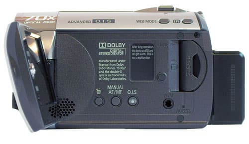 Под ЖК-экраном практически пусто — отверстия встроенного динамика, кнопка удаления файла, кнопка активации ручных настроек (фокуса, диафрагмы и т.д.), и кнопка включения/отключения оптического стабилизатора. На этой же панели расположен аудио-видео выход и слот для карт памяти.
