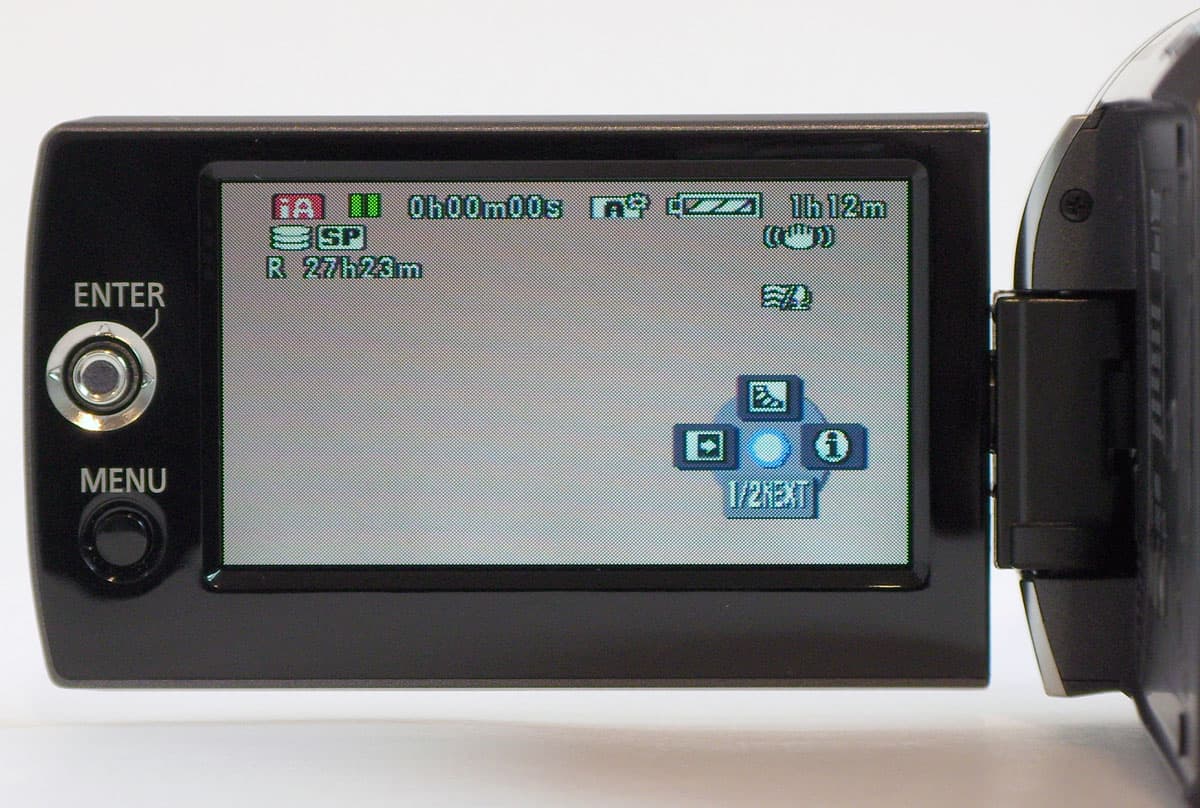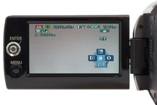В данной видеокамере, наконец-то, реализована функция, которой так не хватает обладателям современных любительских камер, в которых отсутствует видоискатель. Попробуйте-ка во время съемки любой видеокамерой закрыть ЖК-экран, что произойдёт? Правильно, запись остановится. Здесь, к счастью, это не так, данная камера продолжит съёмку и при закрытом экране. Правда, запустить запись можно только при открытом экране.