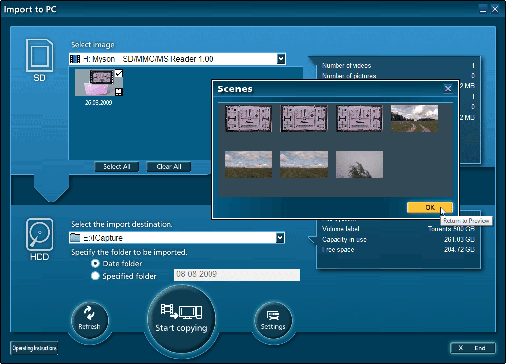 Прилагаемая программа VideoCam Suite является несложным видеоредактором и одновременно программой авторинга. Импорт в программу материала вовсе необязательно производить только с видеокамеры, подключенной к ПК. Он производится с любого носителя, включая DVD-диск либо флэшку. Главное для программы — чтобы в носителе присутствовала вся структура, создаваемая видеокамерой при съемке (служебные папки SD_VIDEO, MGR_INFO и т.д.) с дополнительными файлами индекса, имеющими расширение *.MOI и *.PGI. Сами видеофайлы до переноса на ПК имеют расширение *.MOD. Если эти *.MOD-файлы скопировать на ПК через обычный проводник и вручную переименовать в MPG, то некоторые видеоредакторы могут "не понять" содержащуюся в них информацию (например, соотношение сторон кадра), из-за чего возможны некоторые проблемы.