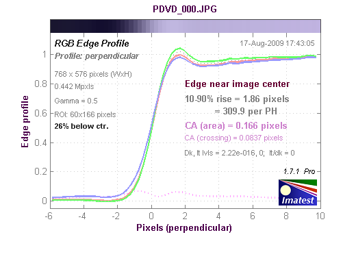 График хроматической аберрации (на самом деле, это тот же краевой профиль, только построенный по каждому цвету в отдельности). При значении параметра CA (area) равным 0-0.5 хроматическая аберрация не заметна.