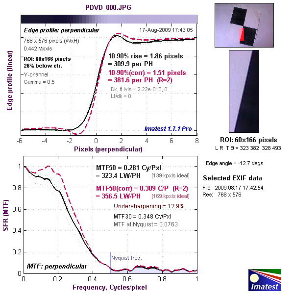 Верхний график представляет собой краевой профиль, для которого приведено значение 10-90% rise distance в пикселях, а нижний график представляет собой MTF (Modular Transfer Function — функция передачи модуляции), для которой приведен параметр MTF50 в циклах на пиксель. Краевой профиль и MTF камеры показаны черной линией. Красной пунктирной линией обозначен краевой профиль и MTF, которые программа Imatest считает близкими к оптимальным. 10-90% rise distance и MTF50 тоже являются расчетными величинами Imatest.