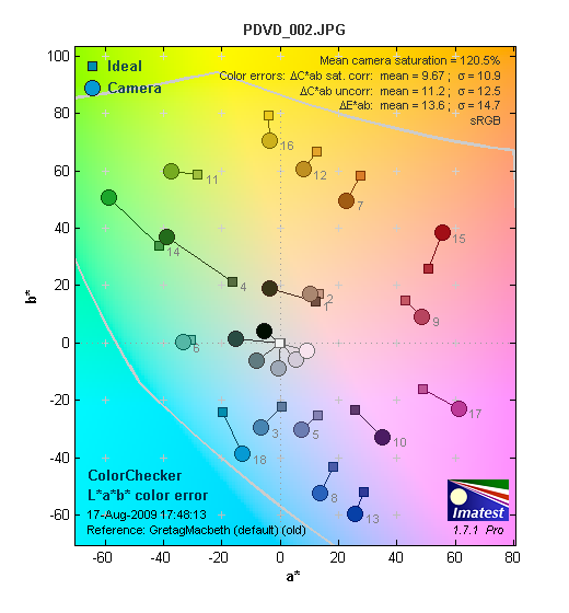 На следующей диаграмме, в графической форме представлены отклонения зарегистрированных камерой цветов от идеала в цветовом пространстве CIE LAB. Данная диаграмма отклонения в Lab показывает, на сколько камера дает ошибку при передаче цвета. Здесь мы видим лишь незначительные отклонения.