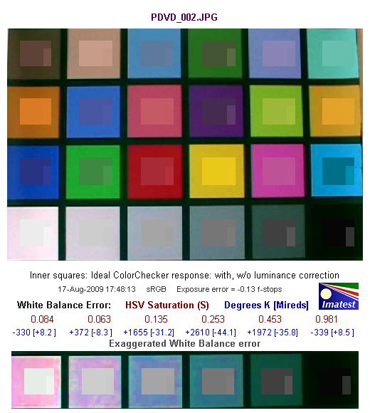 Средняя строчка цифр показывает нам численную оценку ошибки баланса белого в единицах цветового пространства HSV. Так, цифры красного цвета обозначают ошибку по координате S — saturation (насыщенность), цифры синего цвета — в градусах Кельвина [Миредах (Mireds)]. При значении S < 0.02 (речь идет об ошибке по координате S в HSV), ошибка практически незаметна, а при ошибке S > 0.10 она видна, особенно на нейтральных полях большой яркости.
